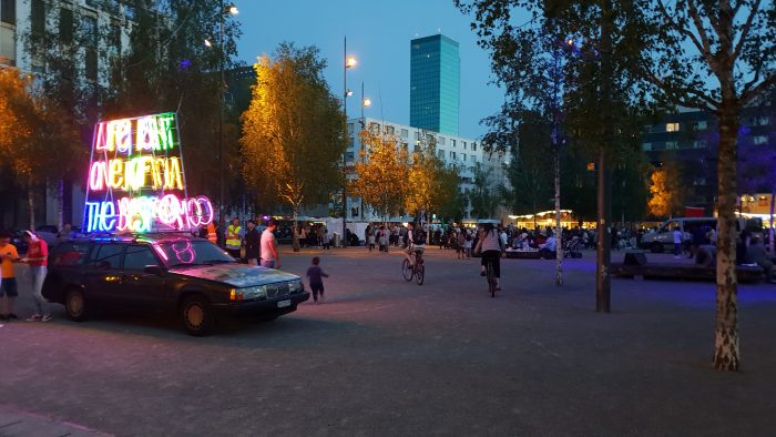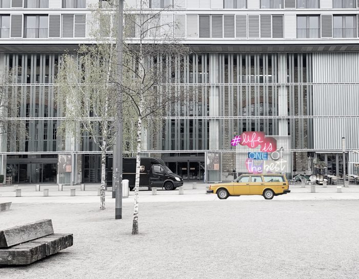 Graffiti, Spraypaint, Billboards: The examination of the culture of the street is a central theme in the works of the Zurich artist duo Veli & Amos. With their works, performances and films, the artists not only play with and at the border between art, commissioned art and commerce, but also with the glory of the street. They contribute their own experience to artistic statements, through which they enable fresh perspectives on the state of society. With their work „Life is one of the best, this is not a commercial“, Veli & Amos offer the Turbinenplatz the summer of a billboard dedicated to moments of real public life. An old monotonously coloured Volvo is placed on the gravel floor of the Turbinenplatz. A light metal construction with two billboards reminiscent of advertisements on the famous American streets in the desert is mounted on top of it. The medium of advertising and consumption is transformed into a living stimulus for the audience, by establishing something obvious: life is something of the most beautiful! This simple statement directs the gaze away from digital noise towards the world.
